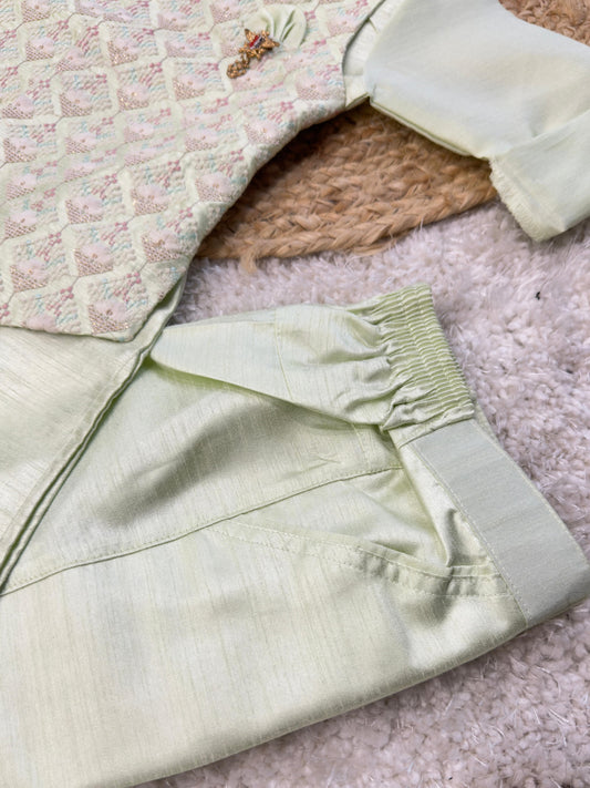 Full Sleeves Solid Color Kurta Pyjama Set with Floral Print Waistcoat Print