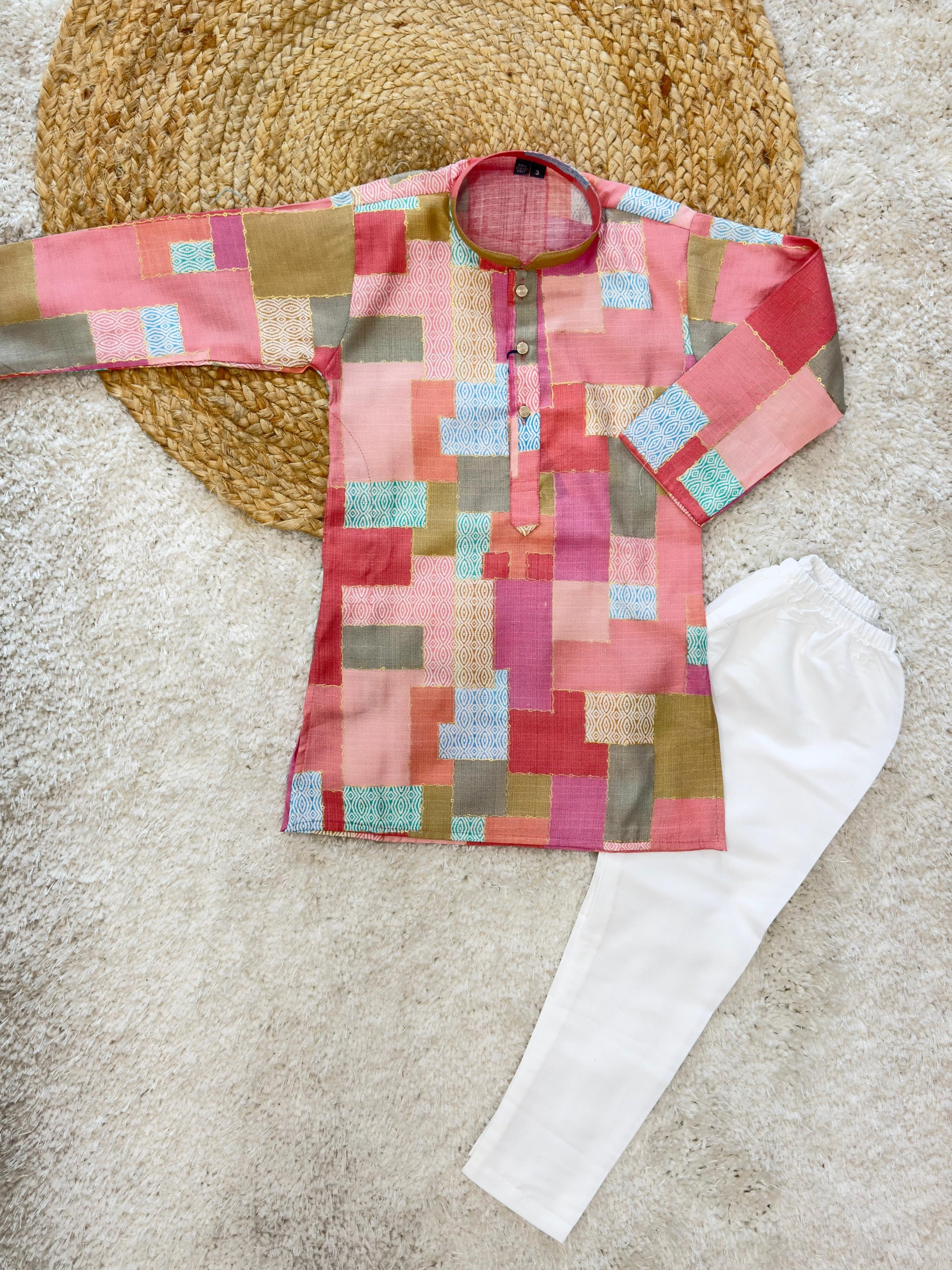 Full Sleeves Solid Kurta & Pyjama with Multicolor box Print