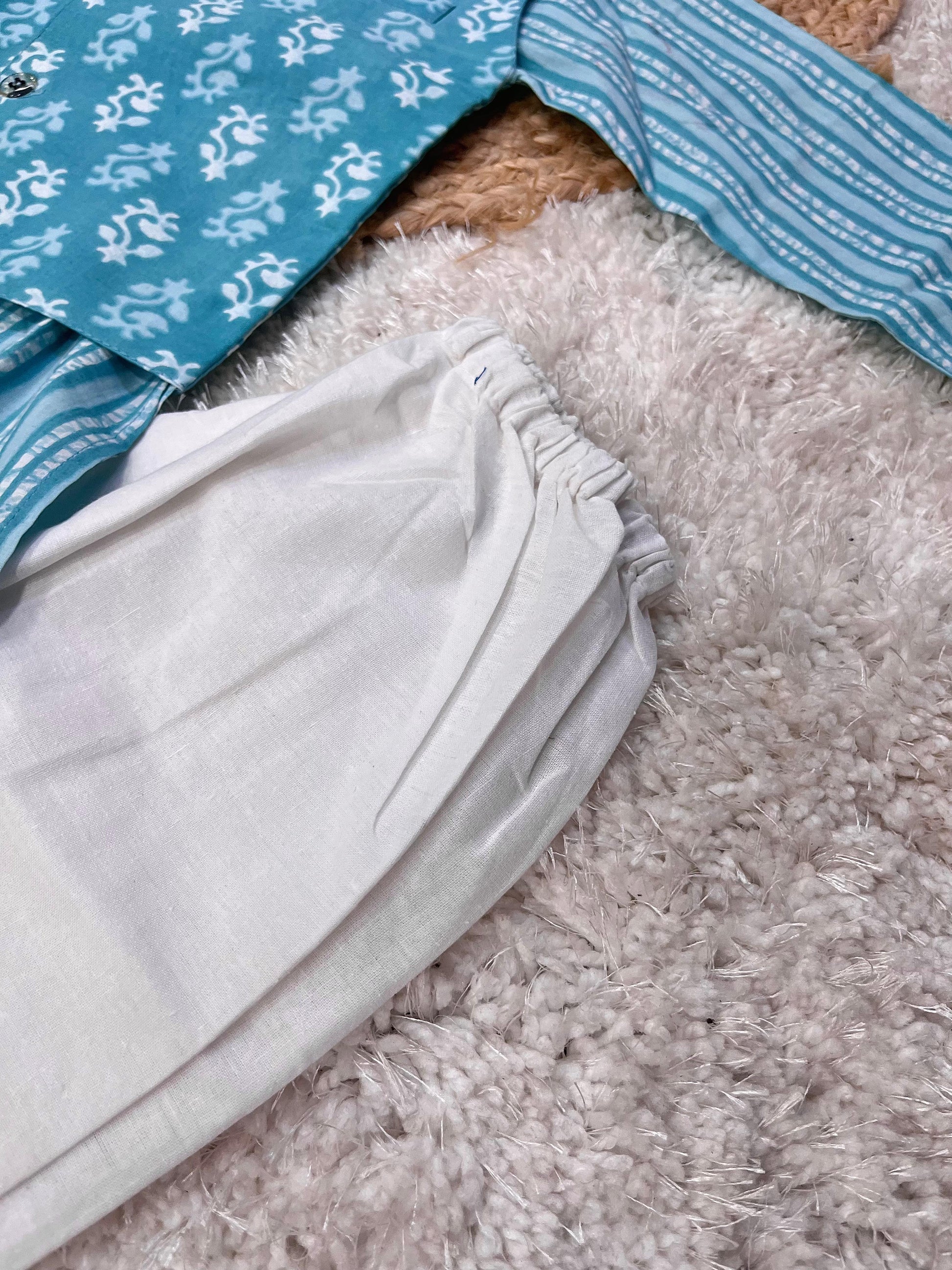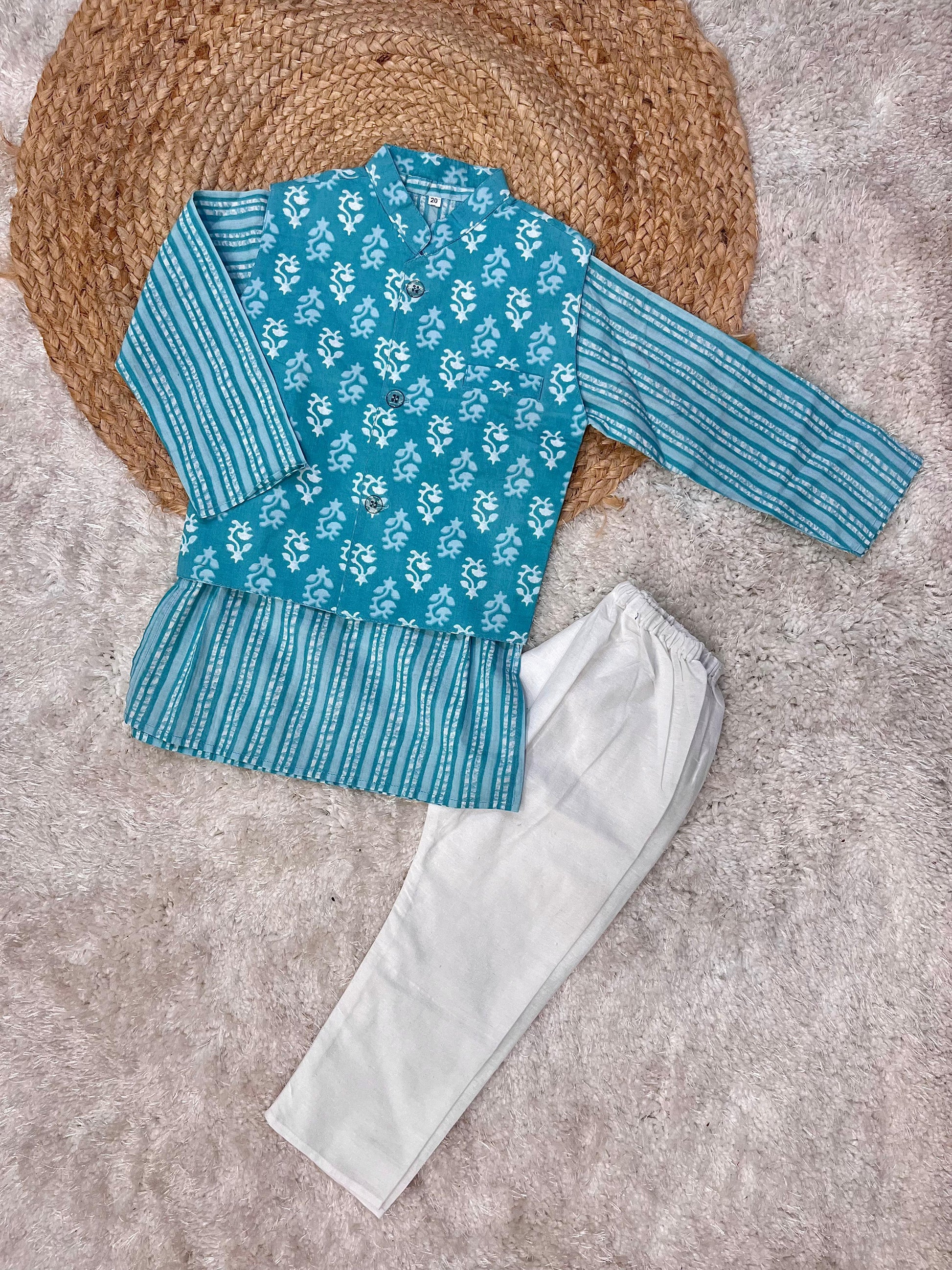 Kid Boy Aqua Blue Color Kurta & Pajama With Floral Print Aqua Colour Jacket.
