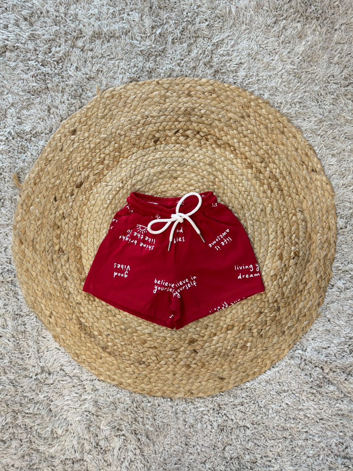 Inject some cheerful vibes into your child's wardrobe with this eye-catching red co-ord set! Featuring a collection of uplifting slogans and playful graphics, this set is designed to inspire and brighten their day. The set includes a comfortable, short-sleeved t-shirt and matching shorts, making it a perfect blend of style and comfort for everyday adventures.