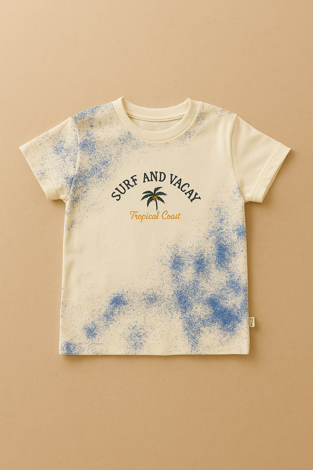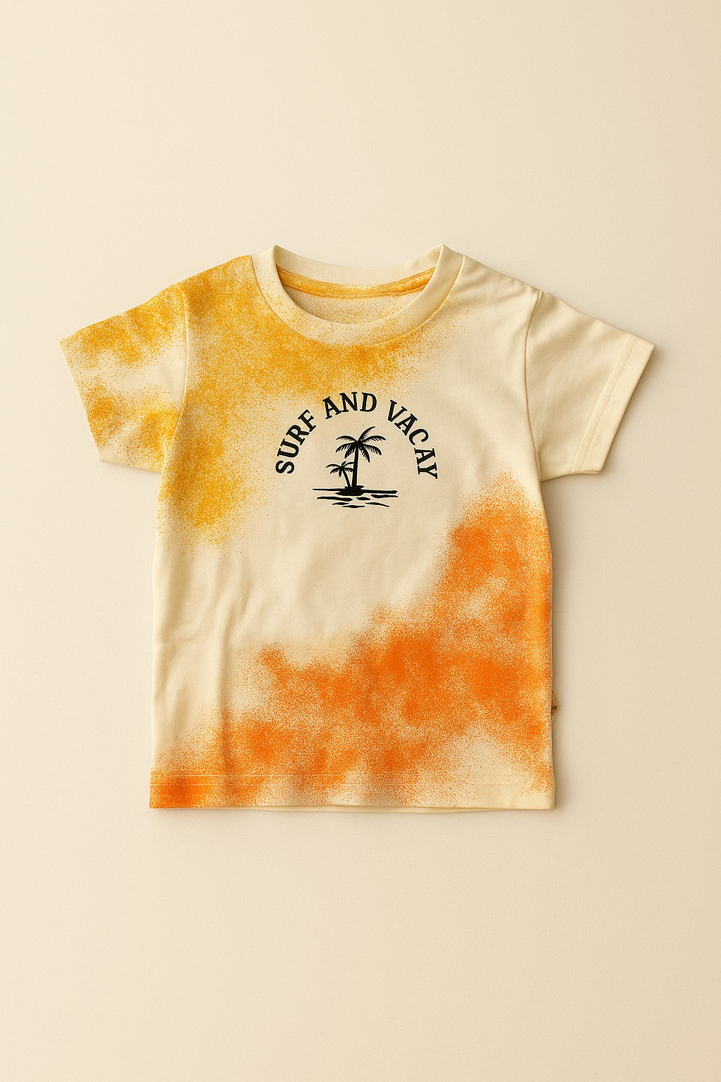 - Let your little one embrace the summer spirit with this breezy and fun "Surf and Vacay" printed T-shirt. Designed for sunshine-filled days, this tee combines comfort, creativity, and style in one standout piece.