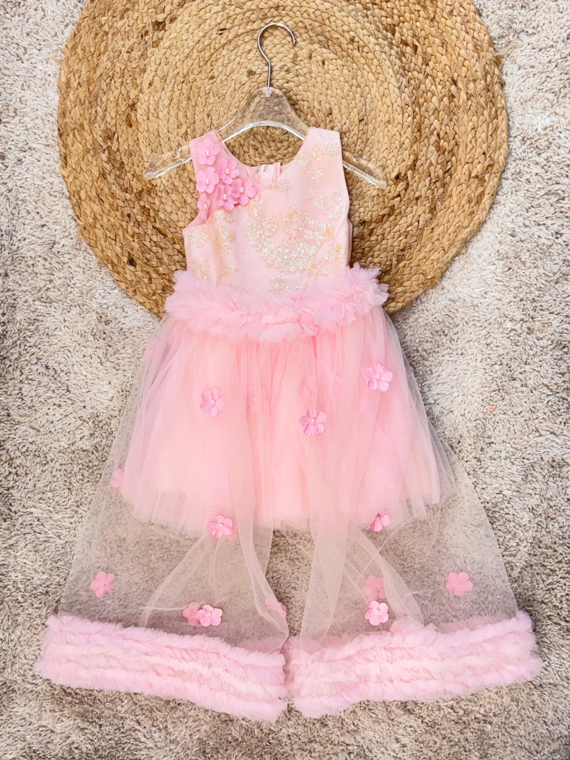 Sleeveless Floral Applique Flower Flared Party Wear Frock With layer - Pink