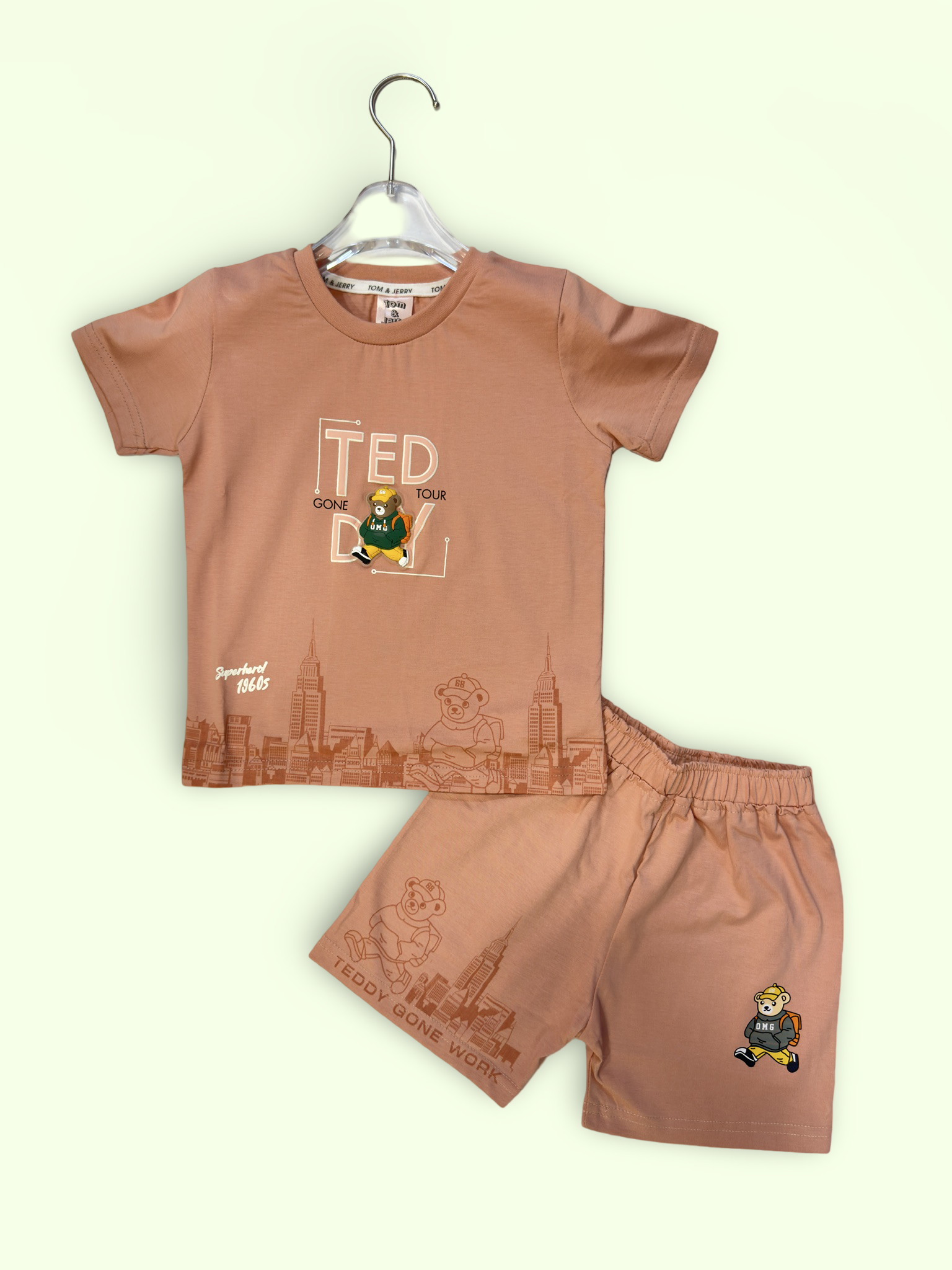 Teddy Explorer Theme: Both the tee and shorts feature a traveling teddy bear graphic, paired with text like “TEDDY GONE WORK” and “GONE TOUR DAY” for a cute, story-inspired vibe.